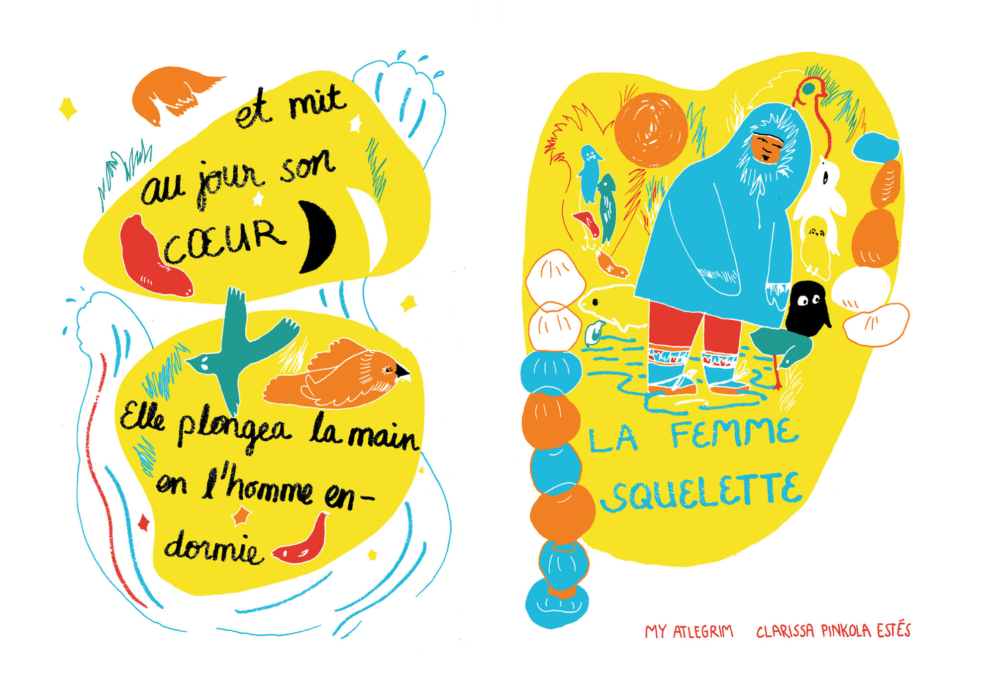 My Atlegrim était notre amie et collaboratrice au sein de Cuistax, elle a disparu lors des attentats du 22 mars 2016 à Bruxelles. Nous avons décidé d’éditer un de ses beaux projets de livre illustré, la Femme squelette (texte de Clarissa Pinkola Estés) en risographie et sérigraphie, en tirage limité.